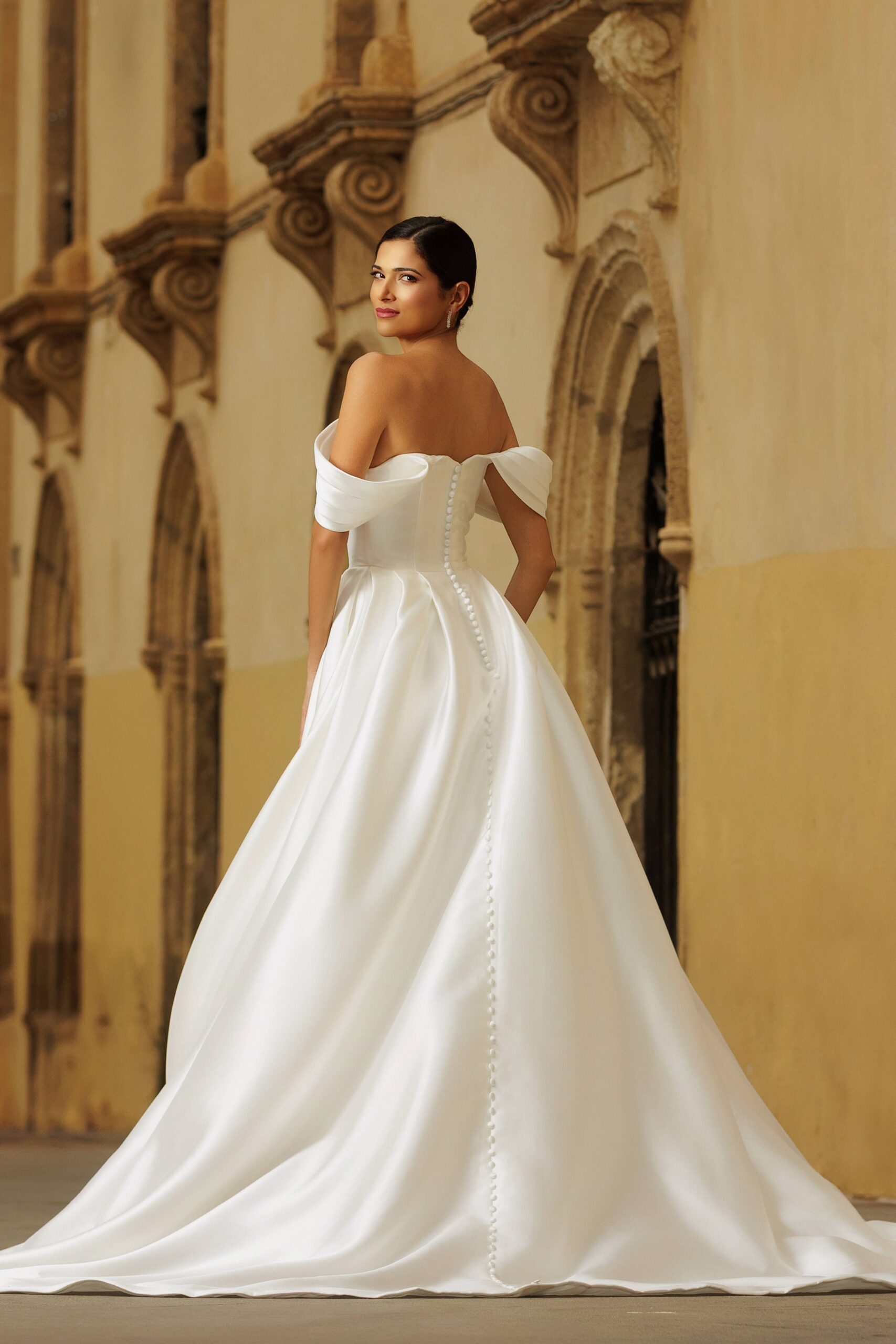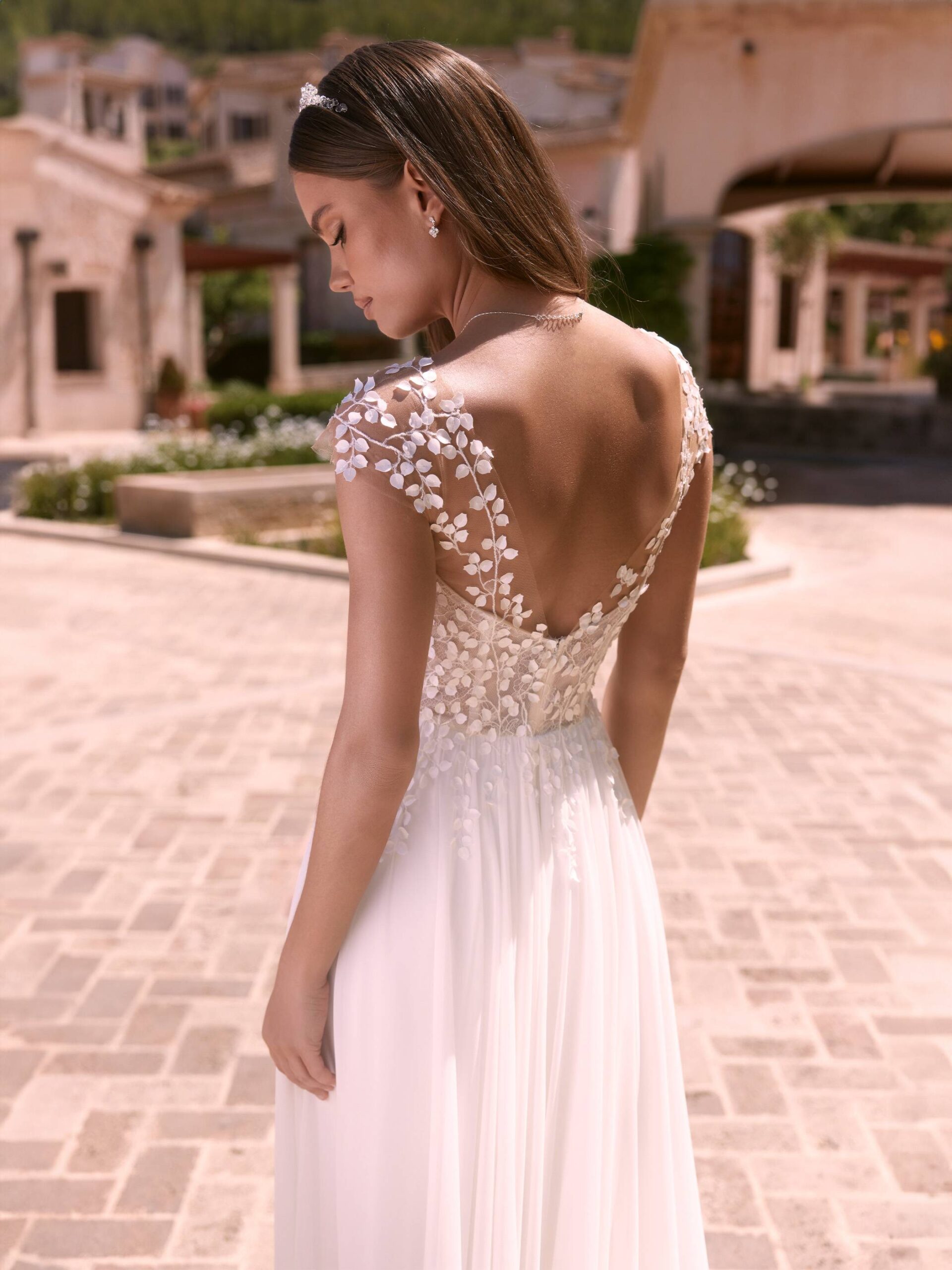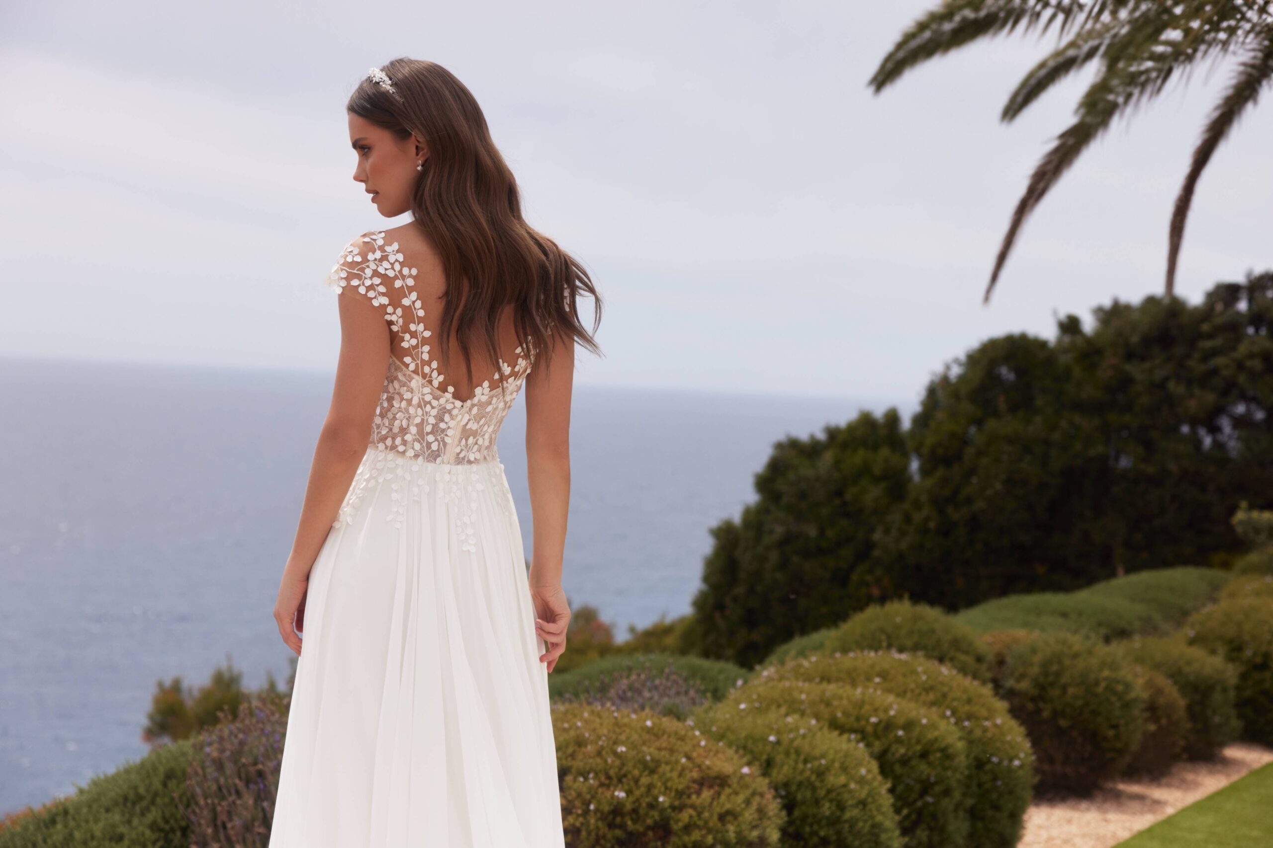 La robe ornée de dentelle idéale pour celles qui veulent se couvrir les épaules avec élégance, sans « casser » la robe avec une étole, et qui ne souhaitent pas de voile de mariée. Salome étant dotée d’un manteau amovible qui a une magnifique traîne