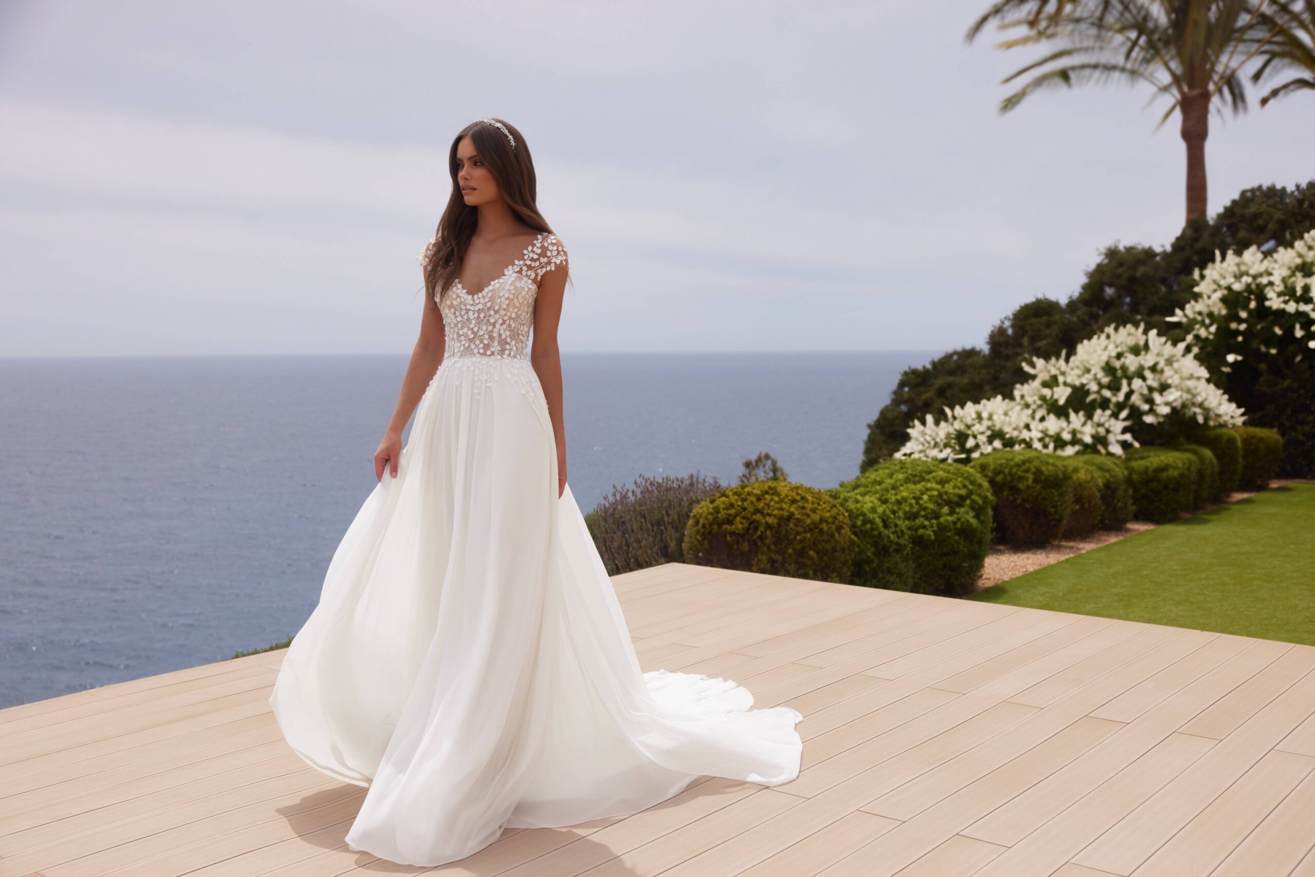 Une belle robe bustier, avec le haut dans une superbe dentelle, et le bas fluide en mousseline. A comparer avec notre robe Romance Suprême mais qui elle est en crepe et près du corps sur le bas. Ou avec le modèle Sandalo qui est un peu évasé comme Orel. Les manches amovibles sont en option
