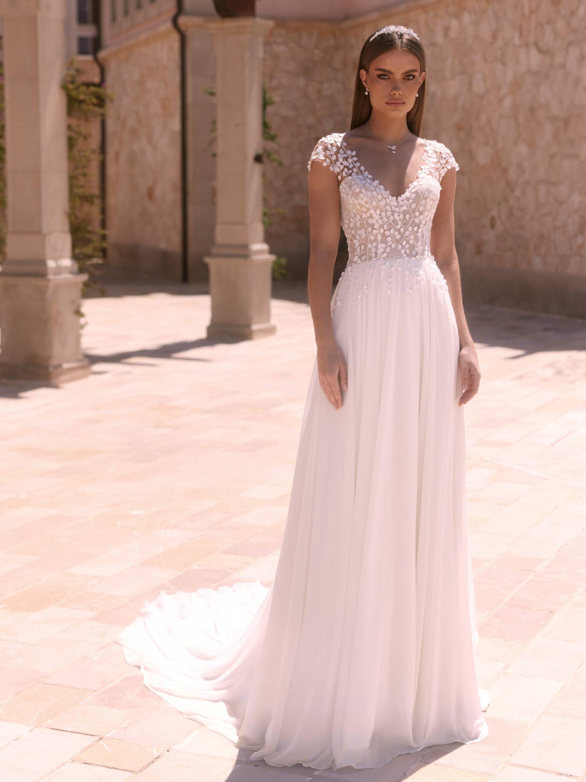 Une robe d’une finesse inouïe avec ses pétales parsemés sur le haut, son décolleté parfait, ses petites manches qui habillent les épaules comme il faut et sa jupe fluide d’une légèreté unique. La traîne peut être raccourcie lors des retouches